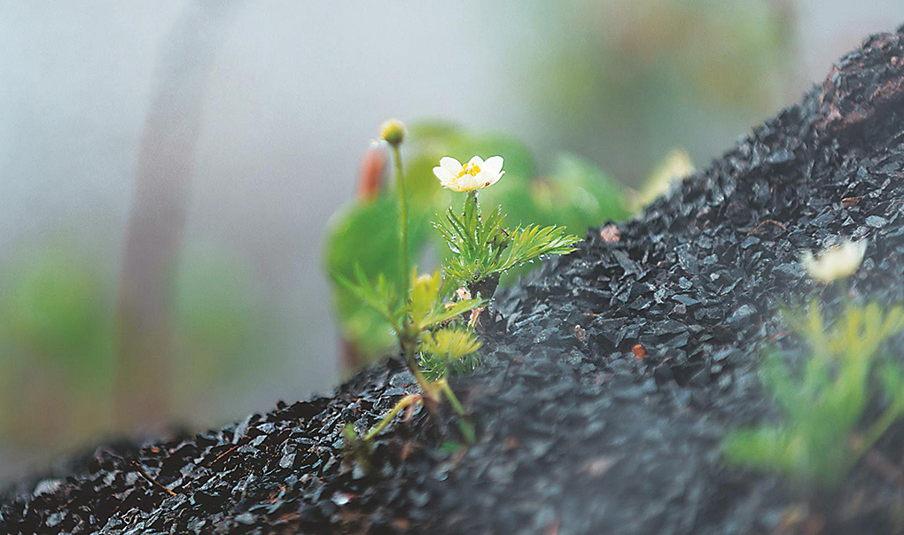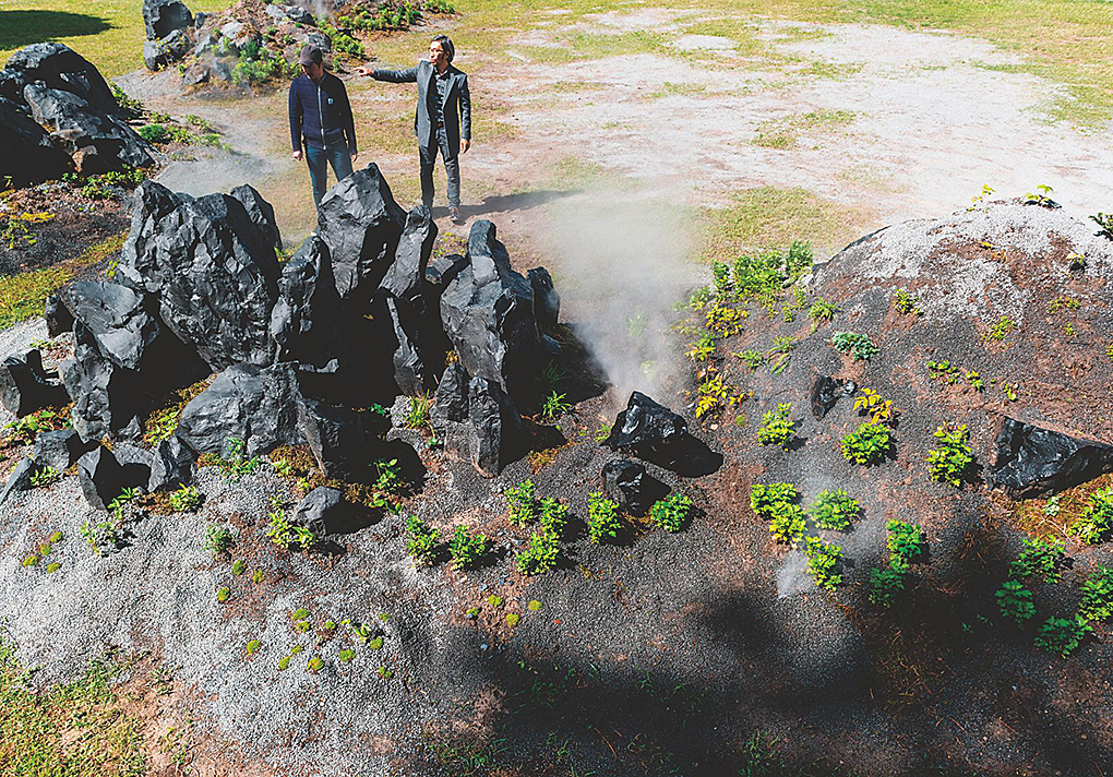 특히 그는 한반도의 산세가 담고 있는 수묵화적 풍경을 정원 예술로 어떻게 구현할 수 있을지 탐색한 끝에 결국 검은 바위 밑에서 피어나는 흰 색깔의 야생화와 안개 분무 장치를 통해서 산수화의 정취를 표현해 냈다.