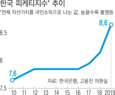 한국의 ‘피케티지수’는 최근 10년간 줄곧 악화했다. 특히 문재인정부 들어 급증했다. 2010년부터 2016년까지 피케티지수는 7.6~7.8 수준이었다. 이 지수는 ‘21세기 자본’이란 저서로 이름을 떨친 토마 피케티 파리경제대학 교수가 만들었다. 수치가 높을수록 소수의 사람이 고가의 자산을 많이 보유하고 있음을 의미한다. 불평등 정도를 가늠하는 지표인 이 수치가 높으면 평균적인 소득을 올리는 사람이 재산을 늘리는 데 훨씬 더 많은 시간이 걸린다는 뜻이기도 하다.