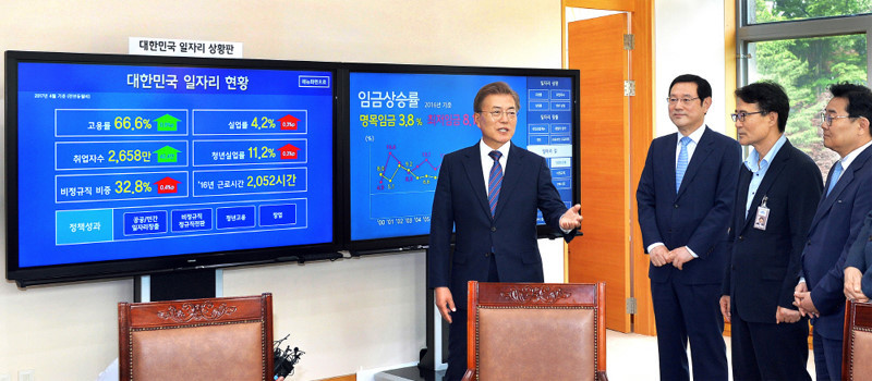 ‘일자리 대통령’을 표방한 문재인 대통령은 취임 첫날 ‘업무지시 1호’로 대통령 직속 일자리위원회를 설치했다. 일자리가 문 대통령의 최우선 국정과제임을 선포하는, 기대가 만발한 장면이었다. 문 대통령은 곧이어 청와대 여민관 집무실에 일자리상황판도 만들어 공개했다. 청와대 조직으로 일자리수석비서관도 신설해 희망찬 출발을 알렸다. 청와대 부서 명칭에 ‘일자리’가 들어간 건 사상 최초였다. 하지만 성과가 변변찮은 일자리수석은 세번째 바뀌었다. 전임 일자리수석 가운데 한 사람은 낙하산을 타고 한국조폐공사 사장 자리에 안착했다.
