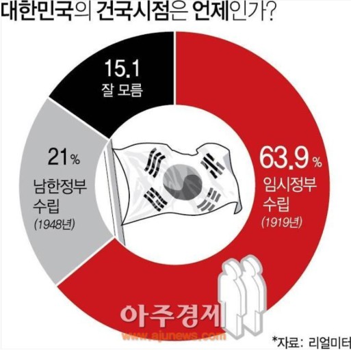 국민 대다수가 1919년을 대한민국 건국 기점으로 여긴다는 두차례 여론조사결과도 이를 뒷받침한다. 박근혜정부 때인 2015년 대한민국 건국 시점에 대한 국민인식 조사 결과, 64%가 3·1운동에 이어 임시정부가 수립된 1919년이라고 응답했다. 해방 후 수립된 1948년 정부라는 응답 21%보다 3배나 많다. 1919년이라는 응답이 모든 지역과 연령층에서 큰 편중 없이 압도적으로 높았다. 2018년 여론조사 결과도 이와 비슷했다. 국민 62%가 대한민국 건국 연도를 1919년 임시정부 수립부터라고 생각했다.