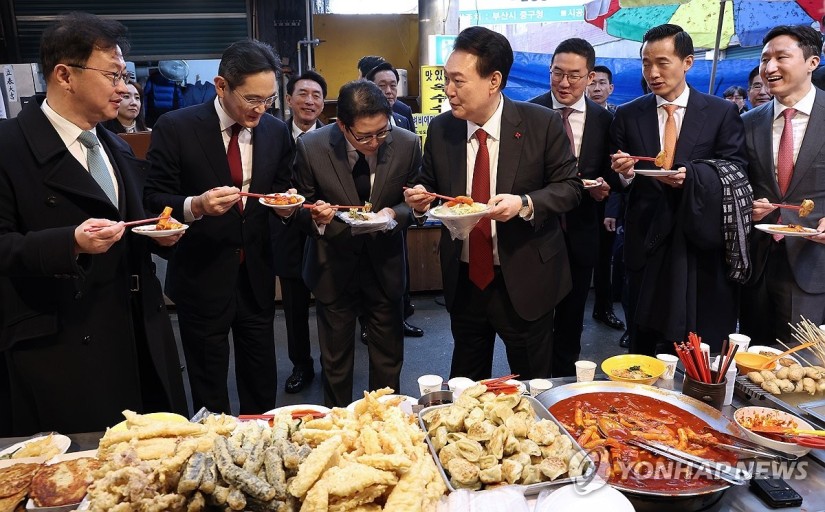 윤석열 대통령의 재래시장 정치는 유별나다. 지난주 부산의 대표 전통시장인 국제시장 일원(국제시장, 부평깡통시장) 방문 이벤트는 기어이 뒷말까지 낳았다. 2030년 세계박람회(엑스포) 부산 유치가 참패로 끝난 뒤 민심을 달래기 위해 기획한 행사가 재벌 총수 들러리 세우기라는 역풍을 불러왔다. 윤 대통령은 깡통시장 분식집에 들러 이재용 삼성전자 회장, 구광모 LG그룹 회장, 최재원 SK수석부회장, 김동관 한화그룹 부회장, 조현준 효성그룹 회장 등과 더불어 떡볶이를 먹는 장면을 연출했다. 대통령과 재벌 총수들이 모여 재래시장에서 서민음식 떡볶이를 먹는 것은 기네스북에 오르지 않을까 싶을 정도로 전례가 없는 일이다.