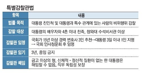 특별감찰관 제도가 도입된 배경을 보면 절실한 까닭이 명확해진다. 이 제도는 박근혜 전 대통령 때 처음 도입됐다. 그의 전임자인 이명박 대통령 때 모든 게 그의 형을 통하면 된다는 ‘만사형통’이란 풍자 조어가 생겨났다. 끝내 친형이 뇌물수수 비리로 감옥에 가는 일도 벌어졌다. ‘왕차관’이란 별명이 붙은 최측근 박영준 전 지식경제부 차관의 전횡까지 더해진 터였다.