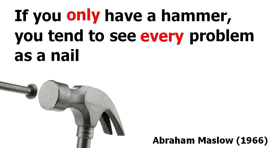 망치를 든 사람에게는 모든 게 못으로 보인다"는 ‘망치의 법칙’은 인간의 욕구를 잘 투영한다. ‘욕구 5단계 이론’으로 유명한 미국 심리학자 에이브러햄 매슬로가 언급한 이 말은 ‘친숙한 도구에 지나치게 의존하는 인지편향’을 뜻한다. 미국 철학자 에이브러햄 캐플런도 "어린아이에게 망치를 주면 두드릴 수 있는 모든 것을 찾아다닐 것"이라는 ‘도구의 법칙’을 제시했다. 특정 해법을 모든 분야에 적용하려고 하는 심리를 족집게처럼 짚어냈다.